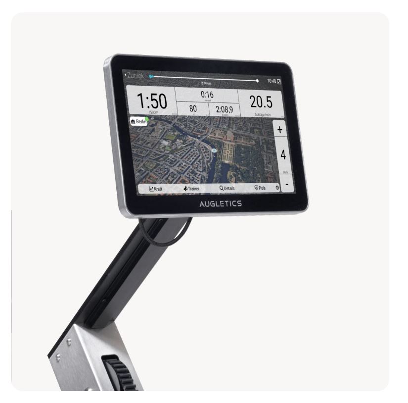 Les AUGLETICS City Maps, qui changent chaque semaine, offrent une variété supplémentaire. Il s’agit de parcours virtuels issus de vues satellite, sur lesquels vous voyez en temps réel d’autres sportifs qui s’entraînent également sur un rameur AUGLETICS. Cela crée un avironnage commun, qui motive en plus et vous donne le sentiment de vraiment progresser. Il est également possible d’utiliser le service externe Kinomap, qui propose une vue immersive directement depuis un bateau d’aviron. Kinomap est un service d’abonnement payant. Vous trouverez de plus amples informations sur https://www.kinomap.com/home.